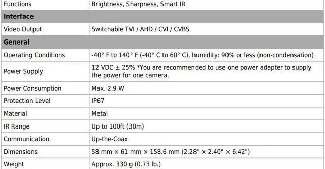 4 in 1 video output (switchable TVI / AHD / CVI / CVBS)