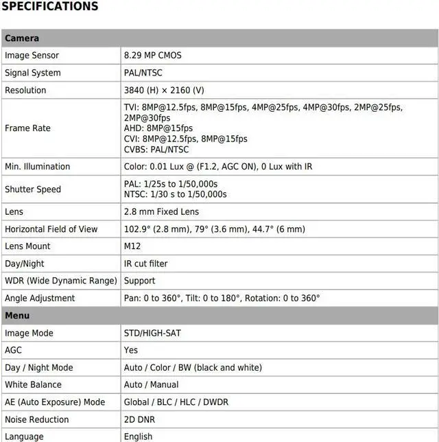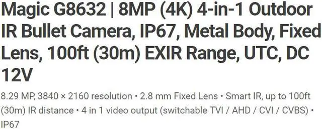 TIR-G8632 Eyemax Magic series TIR-G8632 HD-TVI 8MP UHD 4K Outdoor Bullet IR Camera, 2.8mm, 12V DC 8.29 MP, 3840 × 2160 resolution 2.8 mm Fixed Lens Smart IR, up to 100ft (30m) IR distance 4 in 1 video output (switchable TVI / AHD / CVI / CVBS) IP67