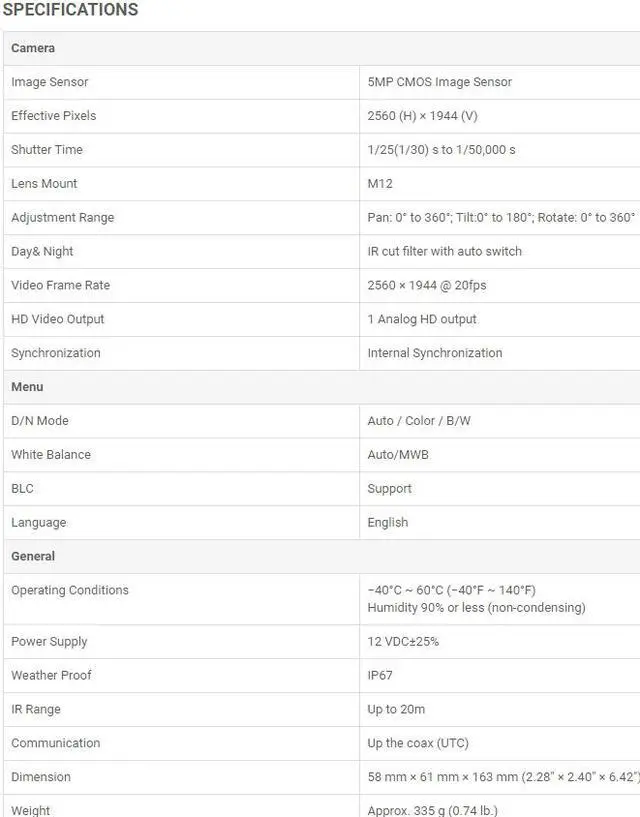 Eyemax Magic series TIR-G5622 HD-TVI 5MP Outdoor Bullet IR Camera, 2.8 mm, 12V DC 5 Megapixel high-performance CMOS Analog HD output, up to 5MP resolution True Day/Night OSD menu, 2D DNR, DWDR EXIR technology, up to 65ft (20m) IR distance IP67 4 in 1 video output (switchable TVI / AHD / CVI / CVBS) Up the Coax (UTC)