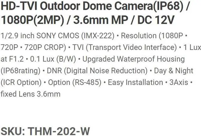 Eyemax Hammer Series Vandal Dome HD-TVI Camera THM-202 1080P, 3.6mm 12V DC ( Made In Korea ) 12V DC