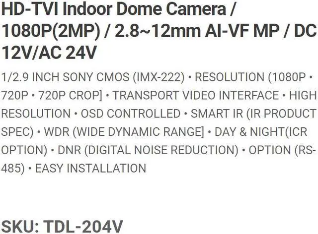Eyemax Superdome Series Indoor Dome HD-TVI Camera TDL-204V-W 1080P, 2.8-12mm Dual Power White Casing ( Made In Korea )