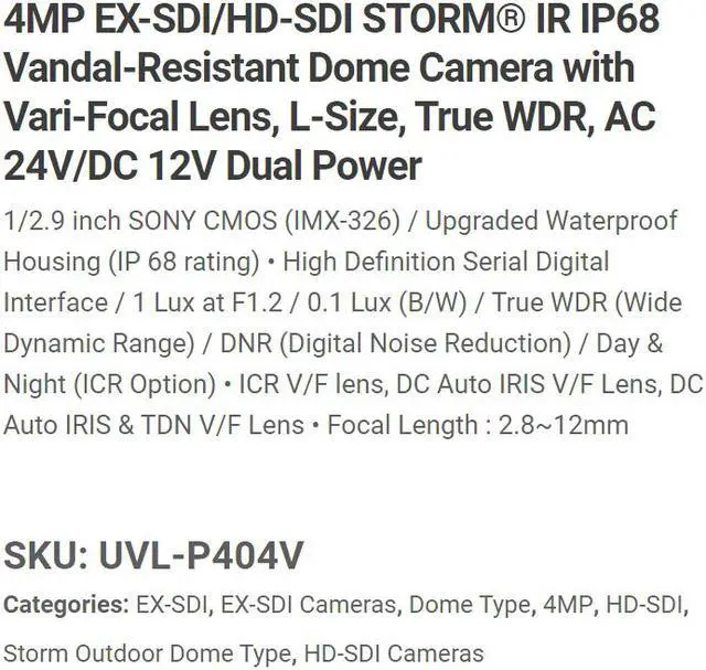 UVL-P404V Eyemax Storm Series UVL-P404V 4MP EX-SDI Vandal DOME Camera 2.8 -12mm Dual Power 1/ 2.9 inch SONY CMOS (IMX-326) Upgraded Waterproof Housing (IP 68 rating) High Definition Serial Digital Interface 1 Lux at F 1.2 0.1 Lux (B/W) True WDR (Wide Dynamic Range) DNR (Digital Noise Reduction) Day & Night (ICR Option) ICR V/F lens, DC Auto IRIS V/F Lens, DC Auto IRIS & TDN V/F