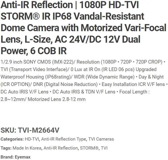 Eyemax Storm Series TVI-M2664V 1080P HD-TVI Vandal DOME IR Camera 2.8-12mm Dual Power, Motorized ( Made In Korea )