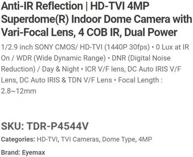 Eyemax Superdome Series Indoor IR Dome 4MP HD-TVI Camera TDR-P4544V 2.8-12mm Dual Power ( Made In Korea ) White case