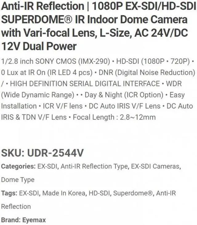 Eyemax Superdome Series Indoor IR Dome 1080P HD-SDI, EX SDI Camera UDR-2544V 2.8-12mm Dual Power ( Made In Korea ) white case