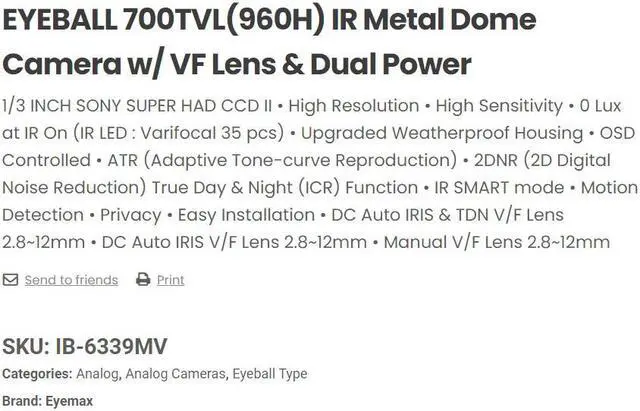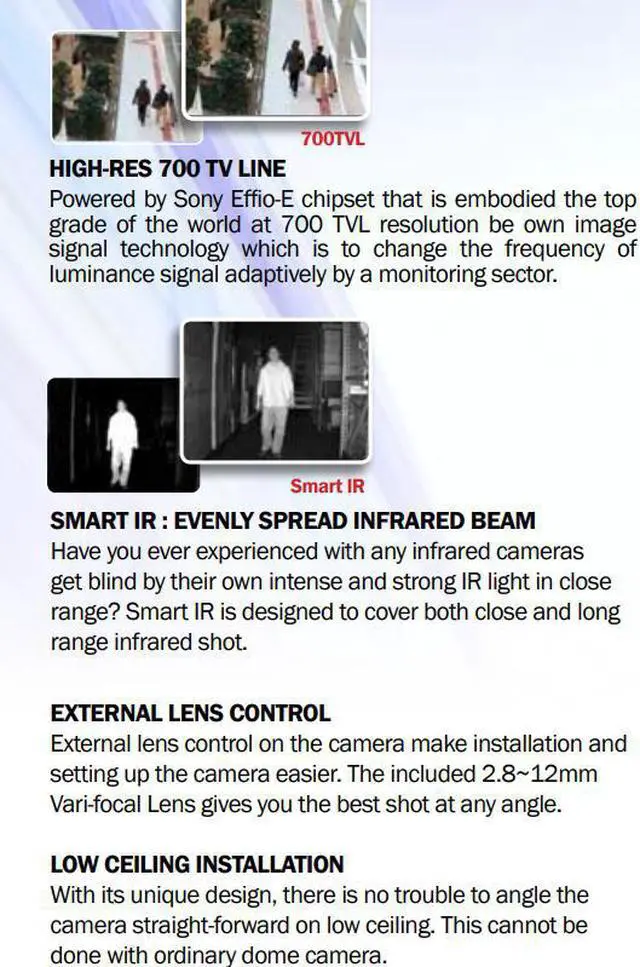 SMART IR: wide spreading 35 IR LED preventing white out at the center of image. 1/3" Sony Super EXVIEW HAD II color CCD sensor High Resolution - 700 (H) TV Line in Color Minimum Illumination - 0 Lux with IR on 2.8 ~12mm Vari-focal Lens Installed Dual Power ( DC 12V & 24V AC ) Made In Korea