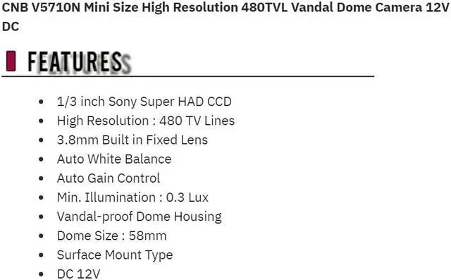 CNB V5710N Mini Size High Resolution 480TVL Vandal Dome Camera 12V DC