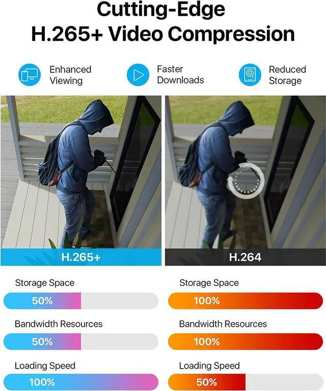 H. 265/H. 265+ 8CH 5MP Lite HD-TVI DVR--With the advanced H. 265 technology, which could double the data compression ratio, keep the high quality video even with low bit-rate, it allows you to maximize storage space and enjoy ultra-long recording.