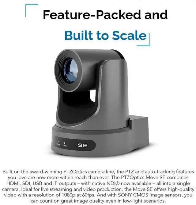 Add a high-resolution streaming and tracking camera to your classroom, house of worship, or conference room for remote meetings with software such as Skype, Microsoft Teams, or Zoom with the PTZOptics Move SE SDI/HDMI/USB/IP PTZ Camera with 20x Optical Zoom. The Move SE camera captures resolutions up to 1080p60 via IP, HDMI, USB-C, and 3G-SDI, and it features auto-tracking for presentations where your subject moves around the room, great for education, how-to, and corporate environments without the need for an operator. It features wide dynamic range, 3D noise reduction, and superior low-light performance. An optional upgrade is available for NDI|HX support.