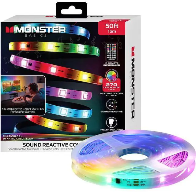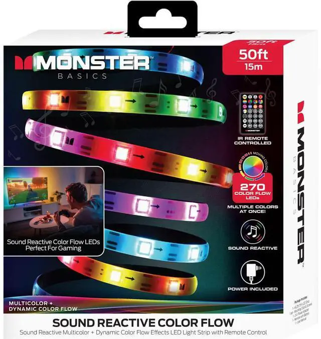 Bring your space to life with the Monster Basics Sound Reactive RGB Color Flow LED Light Strip. Designed with multicolor flow effects and a built-in microphone, this strip reacts to your music by flashing and shifting colors to the beat. Customize your ambiance with the included IR remoteadjust brightness, color, flash modes, and dynamic flowing effects. With easy installation using self-adhesive backing or mounting brackets, this strip is perfect for gaming setups, home theaters, bedrooms, and more. Available in multiple lengths to fit any space.