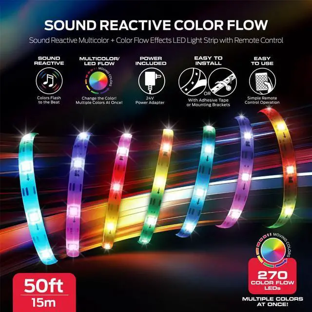 - Multicolor LED Flow Creates dynamic lighting effects that travel up and down the strip with multiple colors shown at once.
