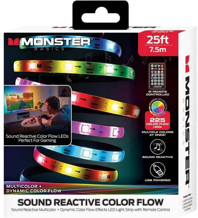 Bring your space to life with the Monster Basics Sound Reactive RGB Color Flow LED Light Strip. Designed with multicolor flow effects and a built-in microphone, this strip reacts to your music by flashing and shifting colors to the beat. Customize your ambiance with the included IR remoteadjust brightness, color, flash modes, and dynamic flowing effects. With easy installation using self-adhesive backing or mounting brackets, this strip is perfect for gaming setups, home theaters, bedrooms, and more. Available in multiple lengths to fit any space.
