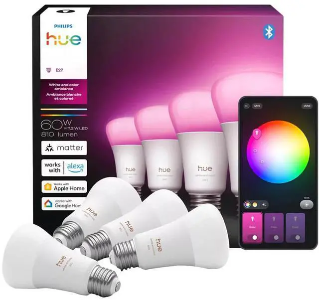 Philips Hue works with Amazon Alexa and the Google Assistant when paired with a compatible Google Nest or Amazon Echo device. Simple voice commands allow you to control multiple lights in a room or just a single lamp. Create a personalized experience with colorful smart light