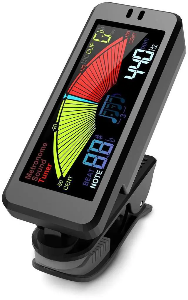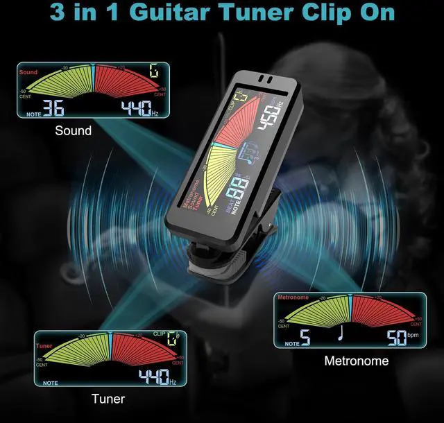 Guitar Tuner, Clip On 3-in-1 Metronome Tuner Tone Generator with LCD Color Screen for Guitar, Bass, Violin, Ukulele, Chromatic, Clarinet, Trumpet, Flute, All Instruments