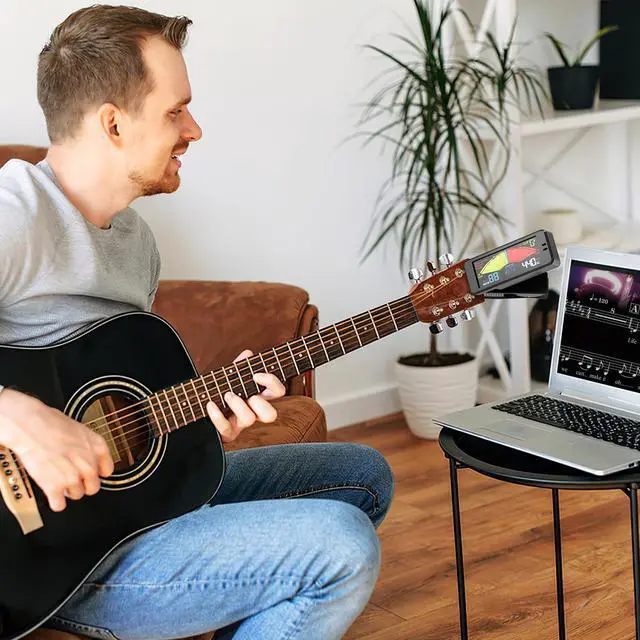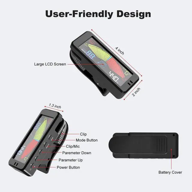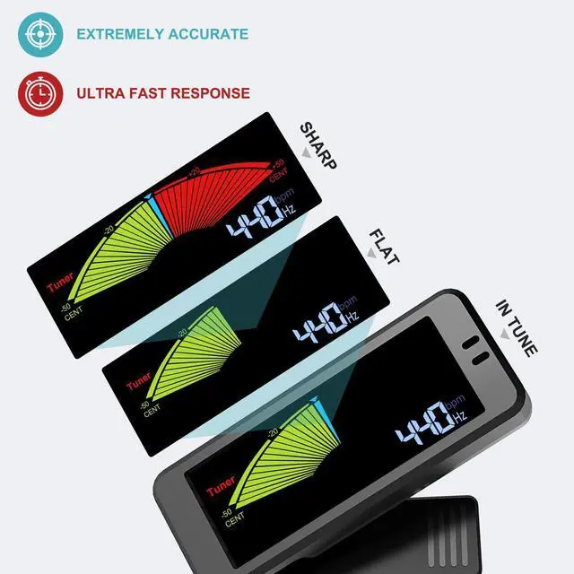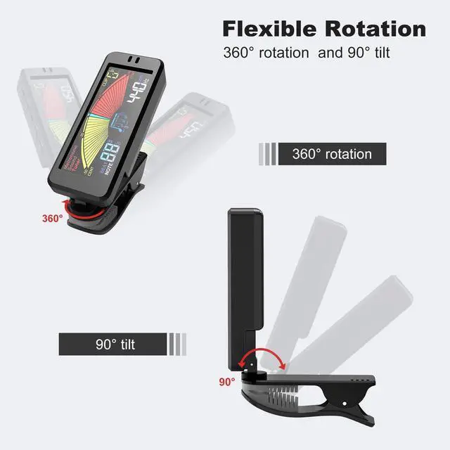 Clip on Guitar Tuner: The clip is stable and protective, and can be adjusted to the ideal viewing angle with smooth rotation. Made of high-quality rubber material, it provides a secure grip without scratching your instrument. The compact and lightweight design fits easily into a pocket or case, perfect for musicians on the go.