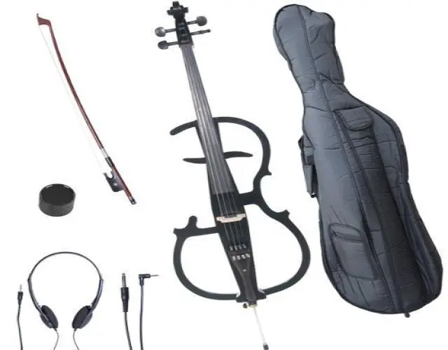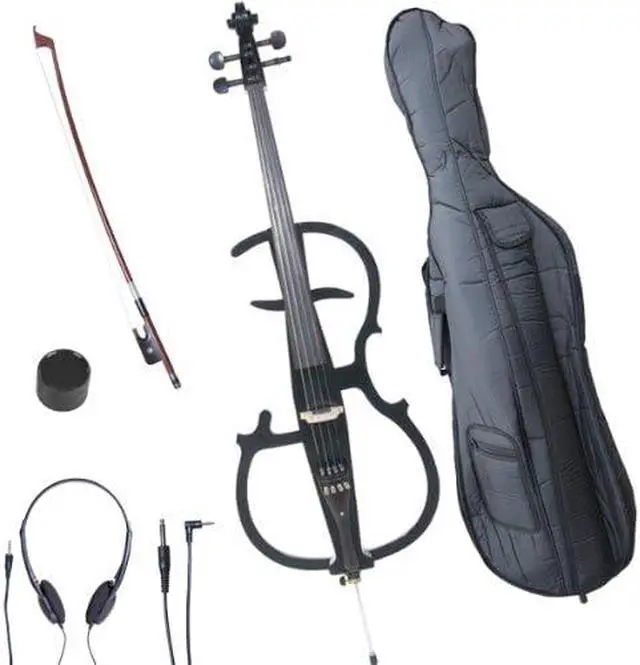 Cecilio CECO-2BK Full Size 4/4 Ebony Electric Silent Metallic Black Cello in Style 2 +Soft Case, Bow & Accessories