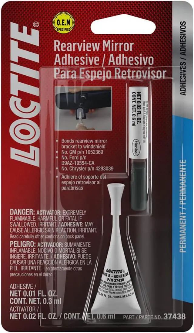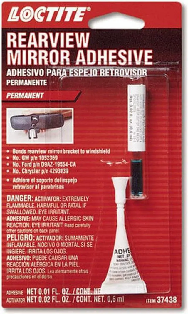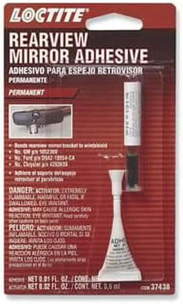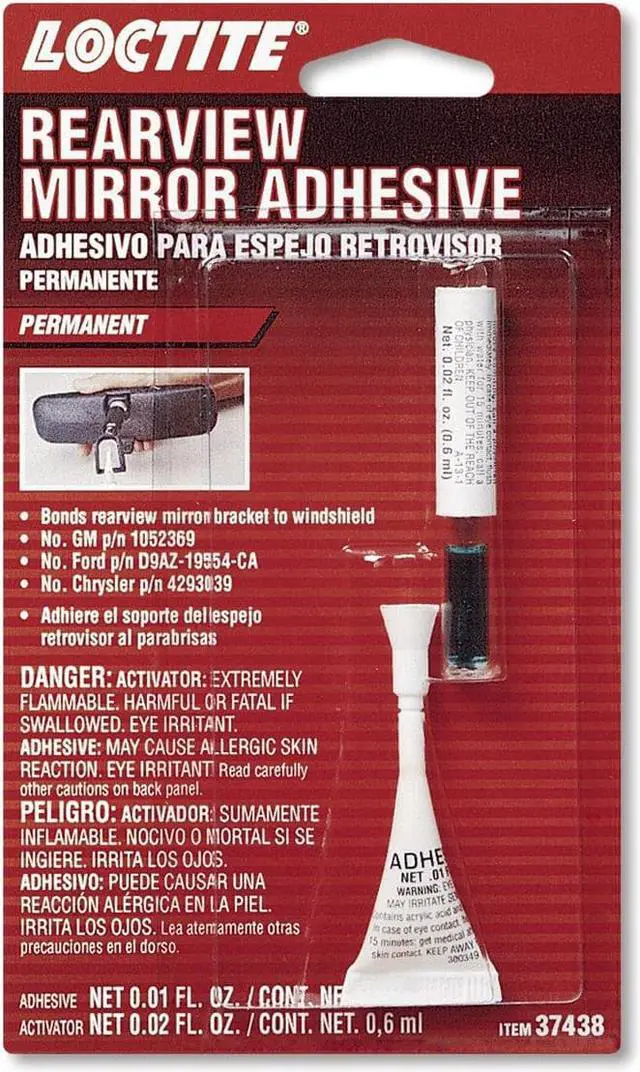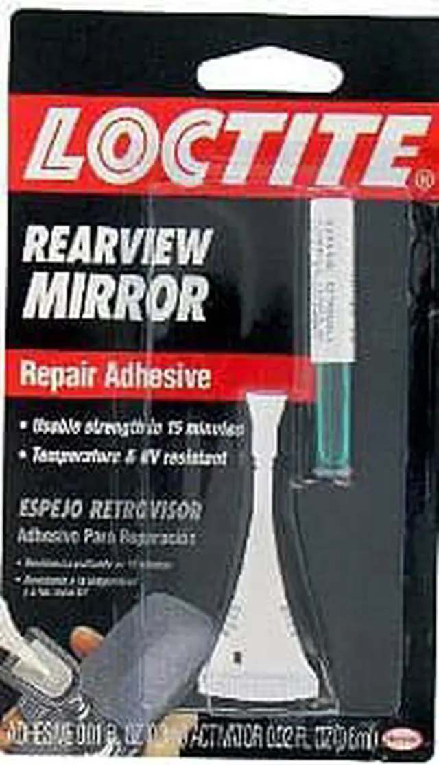 Loctite rearview mirror adhesive is approved and used by GM, Ford, and Daimler-Chrysler. It permanently remounts mirrors to windshields, achieving handling strength in seconds and mirror-mounting strength in 15 minutes.