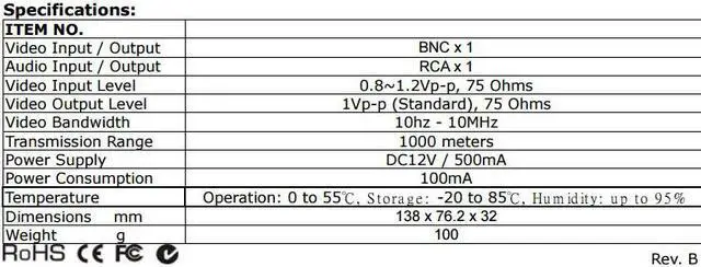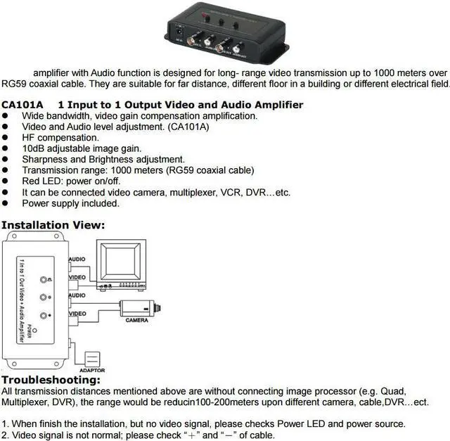 This amplifier with Audio function is designed for long- range video transmission up to 1000 meters over RG59 coaxial cable. They are suitable for far distance, different floor in a building or different electrical field.