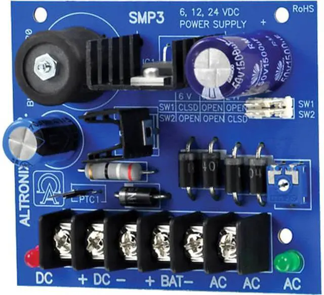 Power Supply 6/12/24Vdc @ 2.5A, Type Power Supply/Charger Board, Material Phenolic or Fiberglass, Length 3.50 In, Width 3.00 In, Height 2.00 In, Input Voltage 12VAC to 28VAC, Voltage OUTPut 6VDC/12VDC/24VDC, OUTPut Current 2.5A Amps, Input Frequency 60 Hz, Includes Battery Leads, Tape