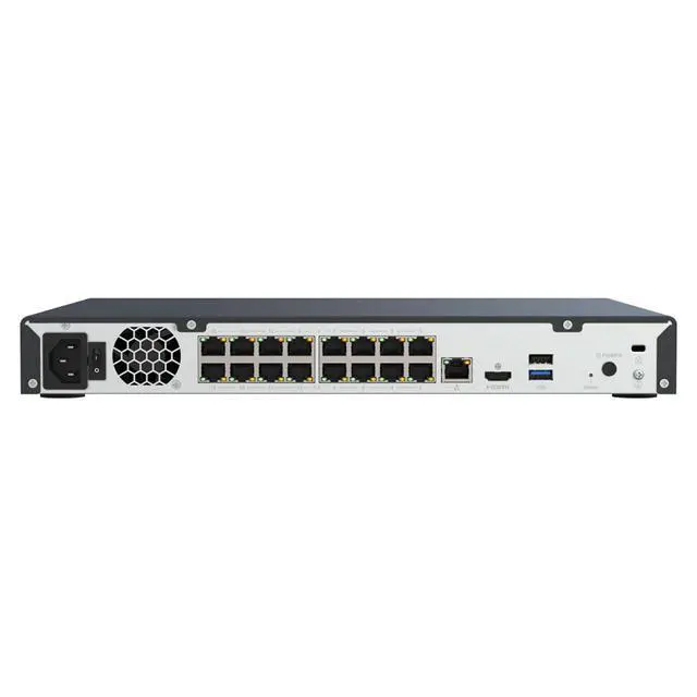 Its 16 PoE+ ports directly powers IP cameras, transmitting both power and data through a single Ethernet cable, eliminating the need for complex cabling.