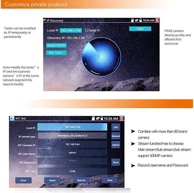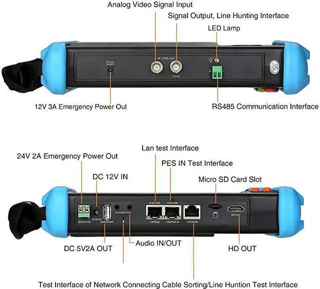 (Note: The product box and manual are generic and include all functions. The actual function of this product is subject to the description. )*****RJ45 cable TDR test, cable quality test. Rapid ONVIF, auto view video, and create testing report. *****Dual window test, IP &Analog camera test. TesterPlay, tester, android version mobile phone and PC display at the same time. *****HDMI output, 1080p. Quick office(excel, word, PPT format ) doc. UTP cable tester. *****Customers self update software. Built in WIFI, create WIFI hotspot. IP discovery, shortcut button, drop-down menu. DC12V 2A, DC48V PoE power output.