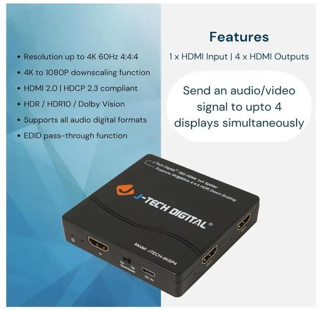 1 HDMI Input to 4 HDMI Outputs This high-performance HDMI splitter 1 in 4 out allows you to connect one HDMI source (e. g., cable box, satellite box, DVD / Blu-ray player, gaming console, Apple TV, Roku, Fire Stick, PC) to 4 HDMI displays simultaneously, ensuring seamless multi-screen viewing.