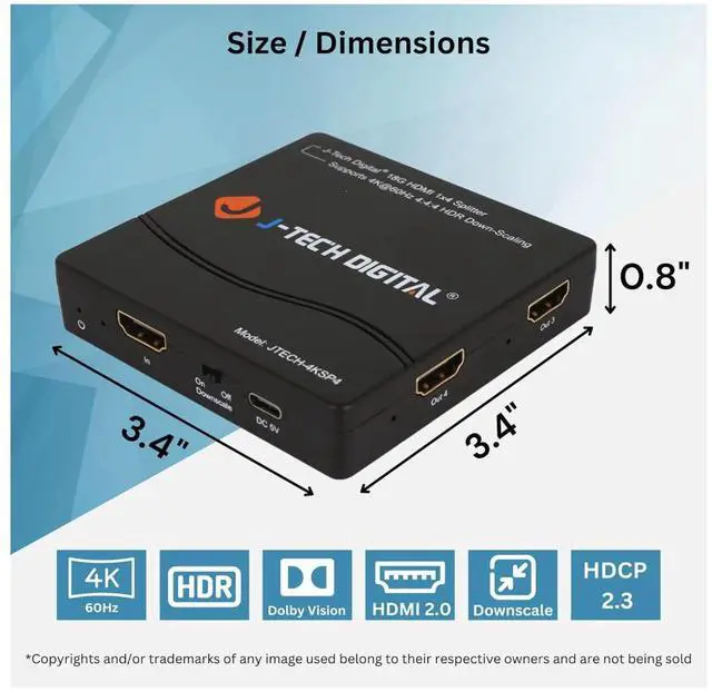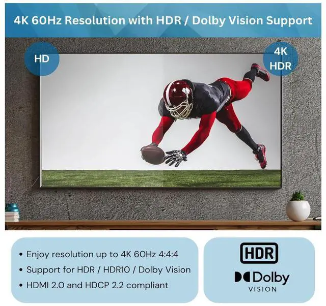 Supports 4K@60Hz, HDR10 & Dolby Vision Experience crystal-clear HDMI 4K splitter performance with full HDMI 2.0 support, 18Gbps bandwidth, HDR10, and Dolby Vision for enhanced contrast and vibrant colors. Fully HDCP 2.3 / 2.2 compliant to work with modern streaming devices and gaming consoles.