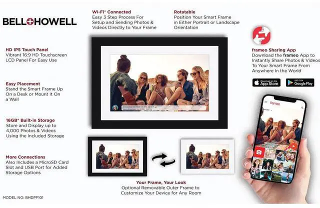 Sharing digital photos and videos in your home has never been easier! Receive photos from your family and friends anywhere in the world with the Bell+Howell smart photo frame. A 10.1 crystal clear HD touchscreen makes it easy for anyone to use. With the Frameo App you can easily capture and share your best moments with your loved ones.