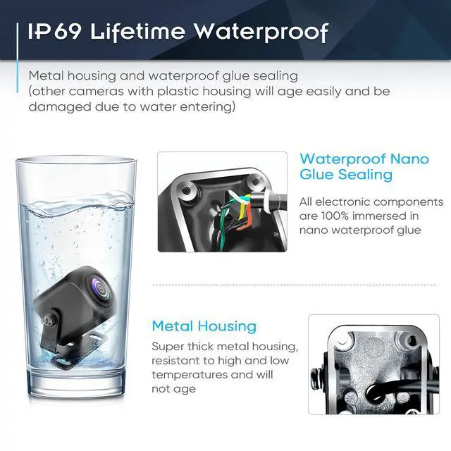 • Super Night VisionEvery rear view camera we designed does not have LED lights. The LED lamps are difficult to seal, which makes the water enter more easily, and the LED light is dazzling for the driver behind. About PixelMan rear camera,we adopt superb lens and sensor chip, wide angle high transmittance lens,large size high sensitive chip, this ensures you back your car easily in the weak light of the reversing light, even at night.