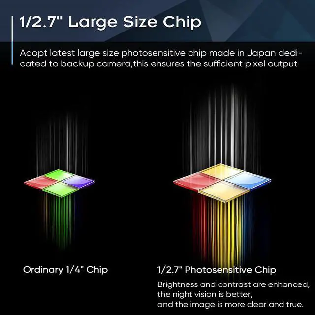 • Latest 1/2.7inch Large ChipThe size of the sensor chip determines the amount of backup camera output pixels. PMD2A adopts latest chip dedicated to back up cameras made in Japan. Compared with the 1/4inch chip used in ordinary back cams, the most significant feature is that the brightness and color saturation are further enhanced on the basis of sufficient clarity. The increased saturation makes the colors more vivid and true, the increased brightness makes the image more clearly.