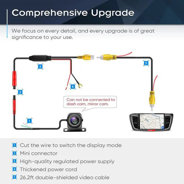 Our video cable is 26.2ft, and the total length from the back up camera to the monitor is 31.2ft. If use the ordinary cable, the signal will be attenuated, it may produce streaks, flicker, etc. The double-shielded wire will effectively avoid this problem. In addition, streaks/ black screens/ flickering are also related to the power supply of the reversing light. Some models of vehicle may need to purchase a 12V DC power adapter filter rectifier to stabilize the current.