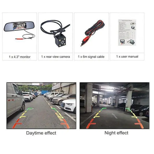 What You Get--- Package List: 1 x Car Rear View Camera, 1 x 4.3" TFT Digital LCD Mirror Monitor, 1 x Monitor Power Cable, 1 x Video Cable, 1 x Camera Power Cable, 1 x User Manual. Any problem, please feel free to contact us, we will provide customers with satisfactory solutions.
