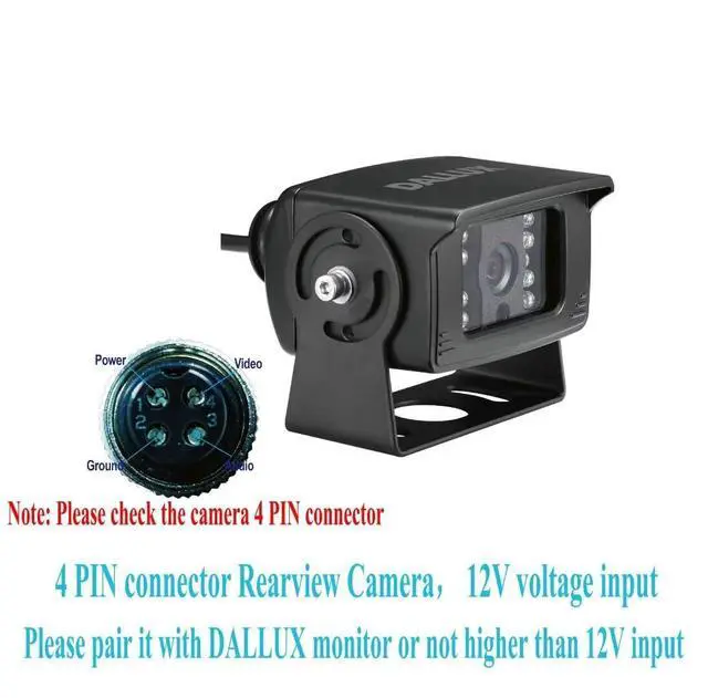- This is a 12V input camera, it can working fine with 12V power supply from the monitor and DALLUX camera monitor system(ASIN: B09HNYDFB7, B07ZX6HFBG, B072M58X9N).