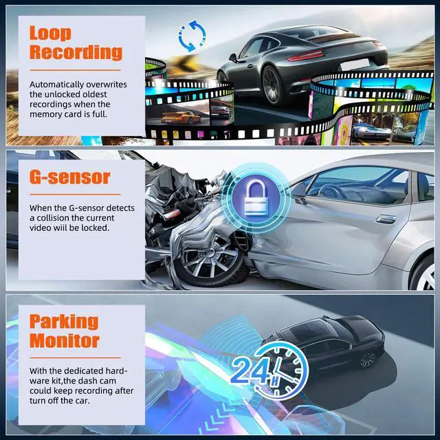 8. Special features: dual cameras, LED display, exposure adjustment, time and date display, motion detection, loop recording