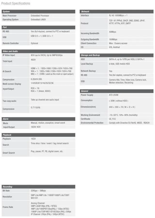 Hardware Features: Alarm in, Alarm out, Audio in, Audio out, BNC Video Out