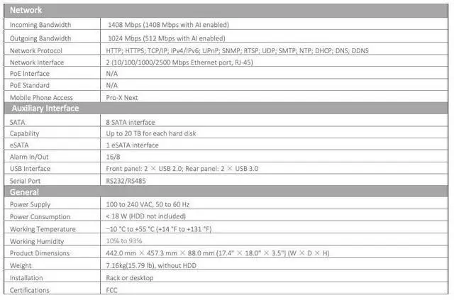 Camera AI Compatibility: Face Detection, Face Recognition, VCA, MD2.0, License Plate Recognition, People Counting, Heat Map, Object Monitoring, Metadata