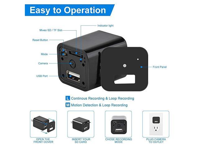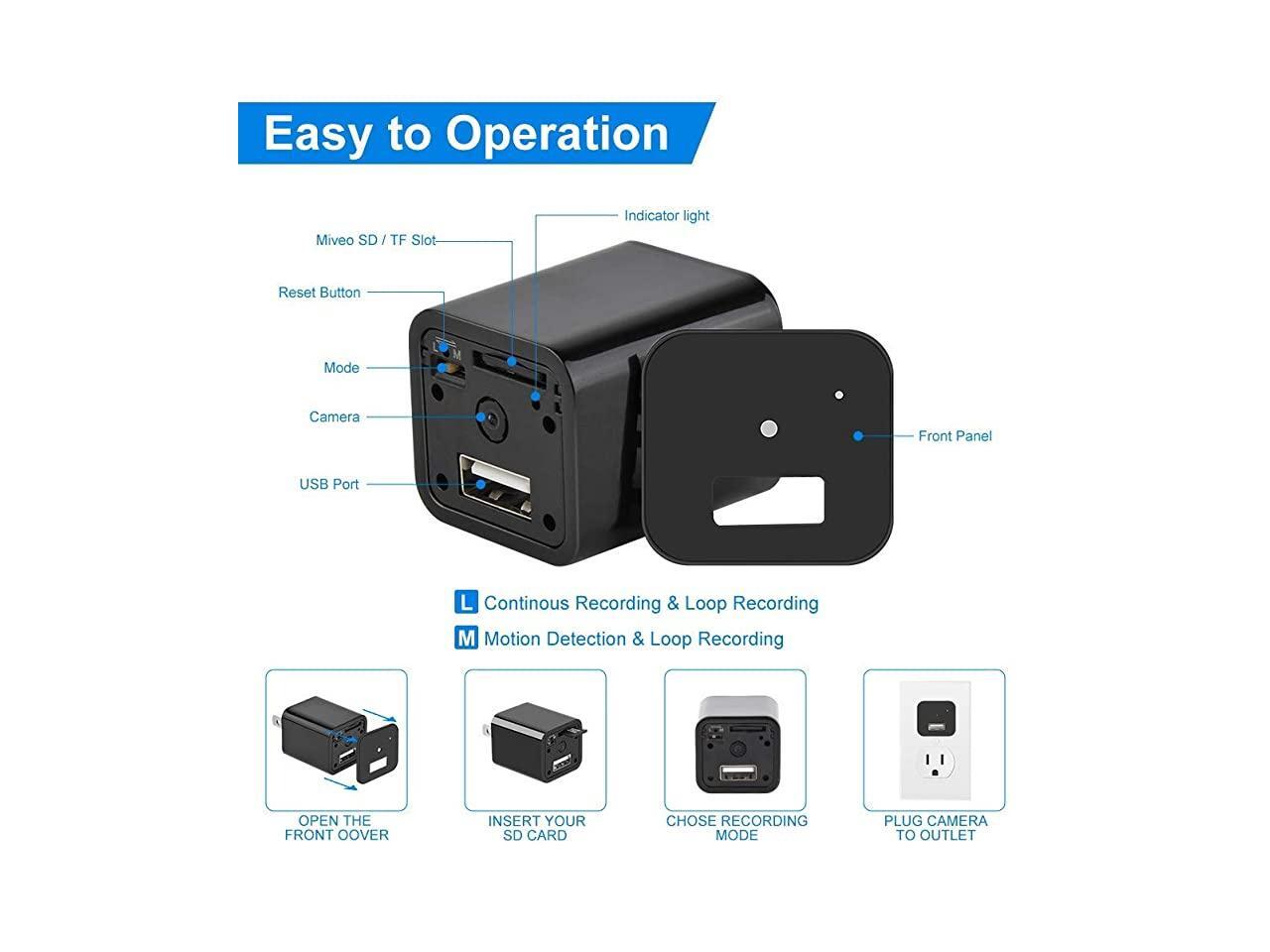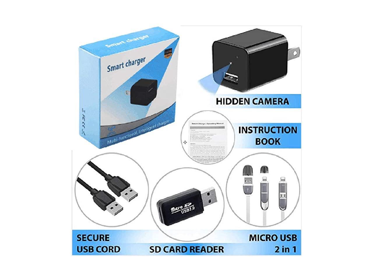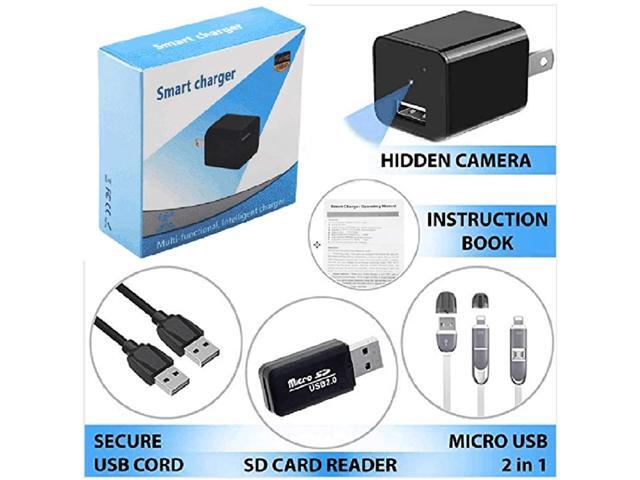 - **********Smart Charger -- This USB charger spy camera is super hidden. It has the same shape as a regular charging head and can be used to charge portable devices. Record full HD video at a wide 90angle.*****Quick Plug and Play -- A smart cam recorder that doesnt require Wi-Fi. Insert your your micro SD card and simply plug the camera in to any wall outlet and select your mode for motion detection or continuous recording.*****Sensitive Motion Detector -- Camera would start record when it see movements. Loop Recording and Memory Card Protection -- The USB spy camera automatically records and overwrites the oldest files when it is full for continuous recording.*****PREMIUM PACK When you receive the camera you will find in the box: 1*Charger Camera, 1*User manual, 1*Memory Card reader, 1*Transfer cable, 1* 2-in-1 micro usb cable for iPhone and other smartphones.*****Super Protection -- Enhanced technology allows to record and charge devices in the same time.Built-in SD card slot,suppor