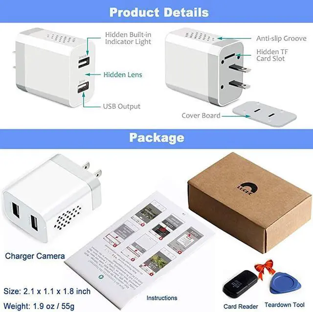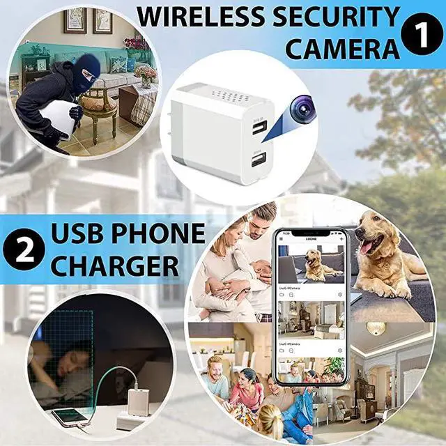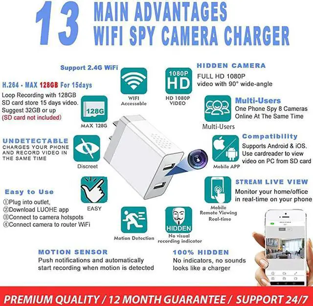 **********WIFI Video Remote View with APP- cam Plug into outlet and download FREE APP, connect camera to wifi to monitor your home/office in real-time on the phone app anywhere. APP supports IOS / Android. *****Easy to USE & Discreet Security Camera--- Quick Plug and Play 1080P Full HD spy camera charger comes with a detailed illustrated manual. signal will auto hide after connected and can't be accessed. *****Motion Detection & Protect Family / Personal Property- USB charger camera adapter will catch a 2mins video when detected movement. Keep an eye on employees/customers/babysitters/nannies/caregivers at home/work/offices/hotels, etc.