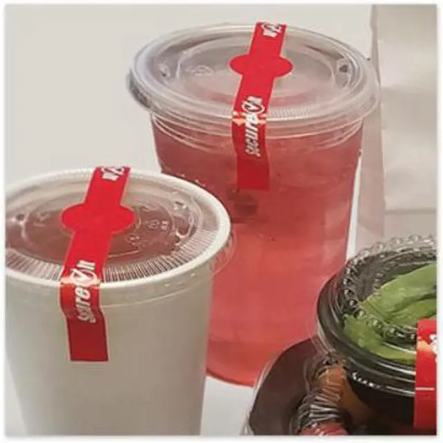 Feature a strong adhesive and special cuts to break if tampered with. Most often used for delivery items to ensure the food is delivered to the customer without tampering. Drink Lid Seal. Closure: Adhesive Backing; For Bag Type: Drink Lids; Preprinted: Secure It; Strap Length: 7".