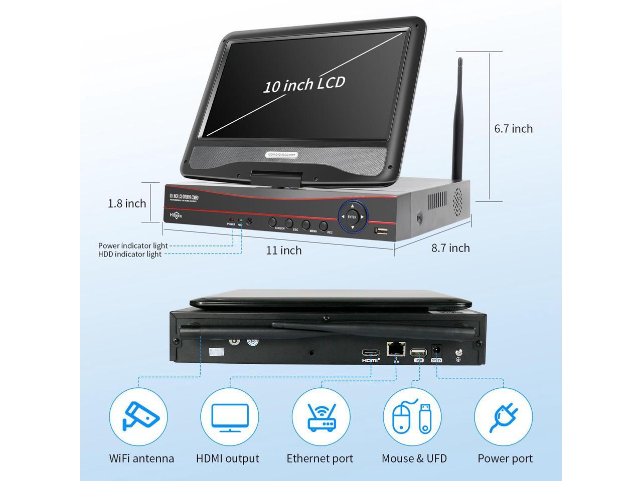 Hiseeu 10'' LCD Wireless WiFi NVR 8 Channels Network Video Recorder, 1080P/3MP/5MP Motion Detection Zones, 24/7 Record, Work with Hiseeu Eseecloud Wireless Camera
