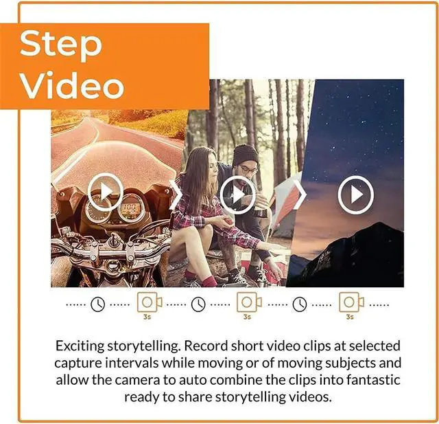 The camera offers three unique capture modes for endless filming possibilities. The Time Lapse mode allows you to take a sequence of photos at your chosen interval and shoot schedule. The Step Video mode lets you record short video clips at selected capture intervals, which the camera auto combines into ready-to-view storytelling narratives. The Stop Motion mode is a fun feature that lets you manually take multiple photos one frame at a time, which the camera auto combines into a dynamic animated video.