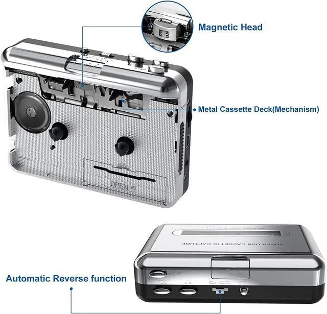 | Recording function | Via a USB cable, you can convert old mix tapes and cassette to MP3 | Convert tape’s music to MP3 files and save into USB flash,no PC required. | One-touch recording through the built-in microphone and play by built-in speaker, recording the external voice, radio or PC music into cassette player. | One-touch recording through the built-in microphone and play by built-in speaker, recording the external voice, recording PC audio from cassette, or AM/FM radio to PC/cassette. | |