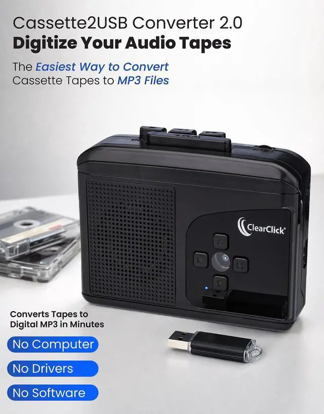 With the Cassette To USB Converter 2.0, it's simple and easy to turn your cassette tapes into digital MP3 format.