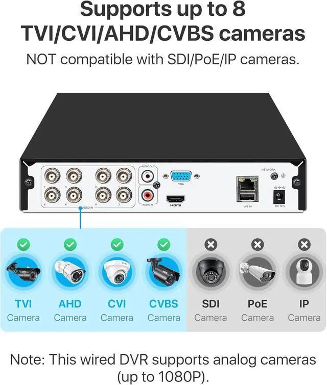 8-Channel Security DVR Recorder: This 8CH 3K Lite 4-in-1 wired DVR is designed for professional-grade surveillance, offering support for analog, HD-TVI, CVI, and AHD cameras. With its 8 channels, it allows you to connect up to 8pcs 960H, 720P and 1080P CCTV cameras(support up to 1080p), providing comprehensive coverage for your home or business. Kindly note: This DVR does not support WiFi, IP, SDI or PoE cameras.
