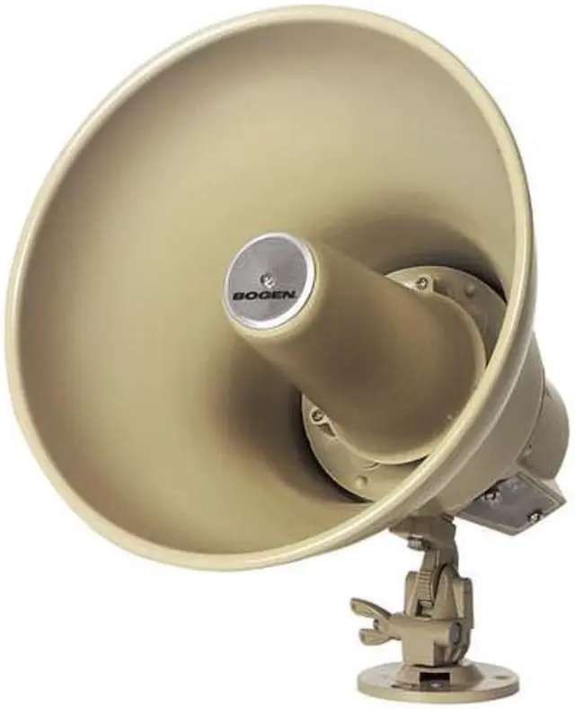 - Bogen reentrant type loudspeaker- 30 Watt- Compact, high intelligibility- Designed for one-way or two-way sound and communication systems- Sturdy, weatherproof, all metal construction is ideal for indoor and outdoor use in industrial plants, warehouses, schools, construction sites, transportation terminals, and recreational areas- Screw terminals make installation fast and easy- Built-in, variable impedance selector switch for matching the speaker power requirements to a 25V or 70V constant-voltage line- Engineered to simplify installation (with a uniquely designed all-purpose mounting bracket) and field maintenance (with a self-aligning, field replaceable diaphragm)- Speaker and mounting bracket are handsomely finished in textured mocha enamel- Beam clamp is also available (optional, BC1)- High intelligibility and efficiency, ideal for both one-way and talk backapplications- Weatherproof, all metal construction- 30 Watts, 25/70 volt or 8-ohm operation- Rotary tap impedance selectorBGSPT30A
