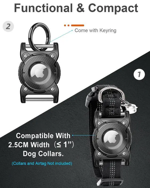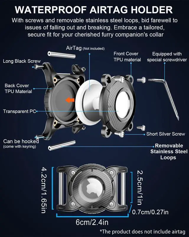 Dog Airtag holder equipped with a special screwdriver and 8 M2*6 screws, copper nut rotary seal and 2 removable metal loops(bars). It will not leak or damage and will not affect the signal when it is 6 meters underwater. Hard, Extra Durable and Wear-resistant. Airtag holder for dog collar made of high-quality TPU material, strong and not easy to broken.