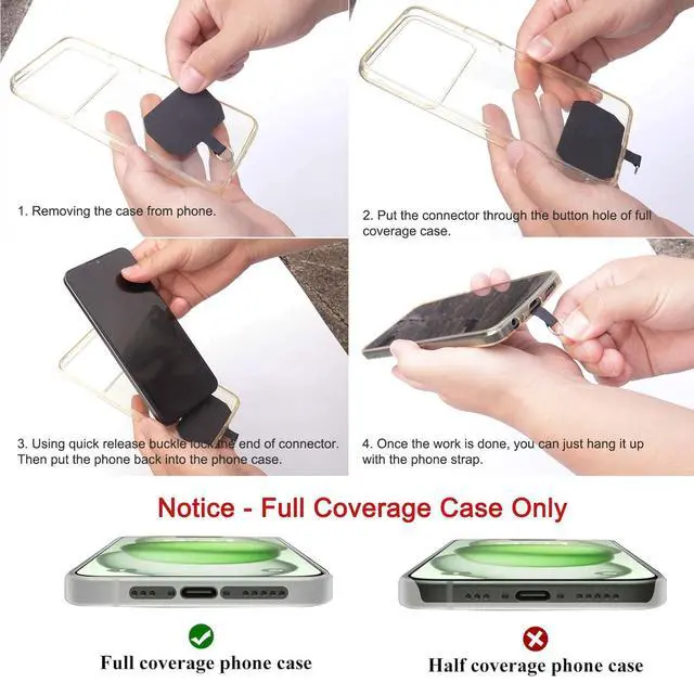Our Phone Lanyard is connected to the mobile phone through a patch that is placed inside the phone case. And the lanyard only needs to be buckled to the metal ring of the tab. Note : the half cover phone case is not supported.