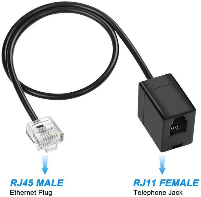 RJ45 to RJ11 telephone Jack adapter cable connects analog telephone devices (phone, fax, caller ID) through the Ethernet jack. Converts phone jack to network jack, suitable for phone line to network line use.