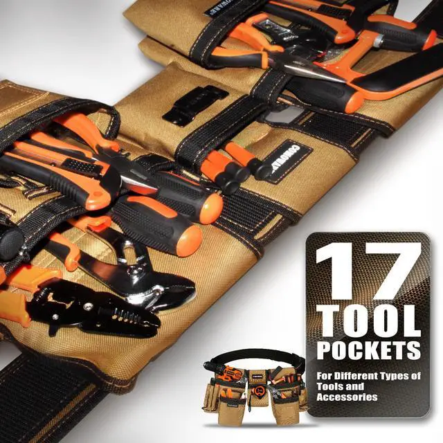 Tool Belt for Electricians & Construction Workers, Adjustable Heavy Duty Work Belt with Magnetic Zone, 17-Pocket Detachable System, Padded 600D Polyester Tool Belt for Men, Coffee Brown