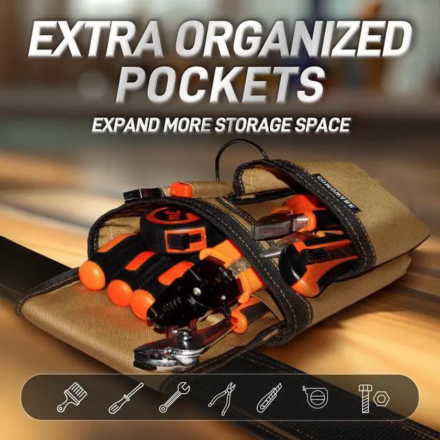 [High-Capacity Organized Storage] Three modular pouches offer 17 pockets sized for pliers, drills, screws, and more. Color-coded compartments simplify tool retrieval, while the coffee-brown finish resists stains from grease or dust.